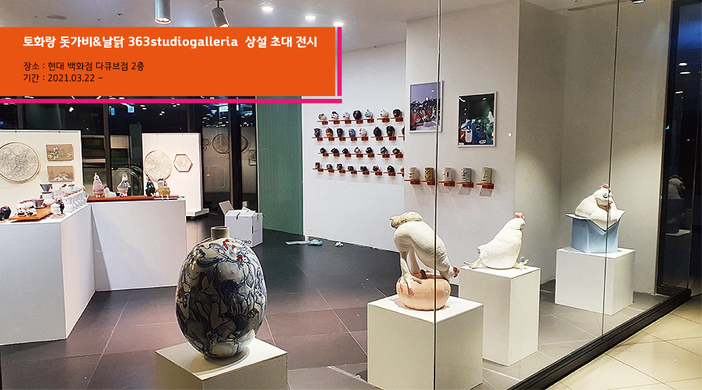 토화랑 “돗가비&날닭” 363studiogalleria 상설 초대 전시 2021. 3. 25. 14:23 토화랑 “돗가비&날닭” 363studiogalleria 상설 초대 전시 장소 : 현대 백화점 다큐브점 2층 (신도림) 기간 : 2021.03.22 ~ 공유하기 게시글 관리 토화랑 Ceramic Studio 저작자표시 비영리 변경금지 (새창열림) 사업자 정보 표시 토화랑 | 김형준 | 경기도 고양시 덕양구 용현로 49-4 B1 (구)행신동 746-10 B1 | 사업자 등록번호 : 128-91-63204 | TEL : 031-978-9976 | Mail : thr2003@naver.com | 통신판매신고번호 : 제 2019-고양덕양구-0440호호 | 사이버몰의 이용약관 바로가기