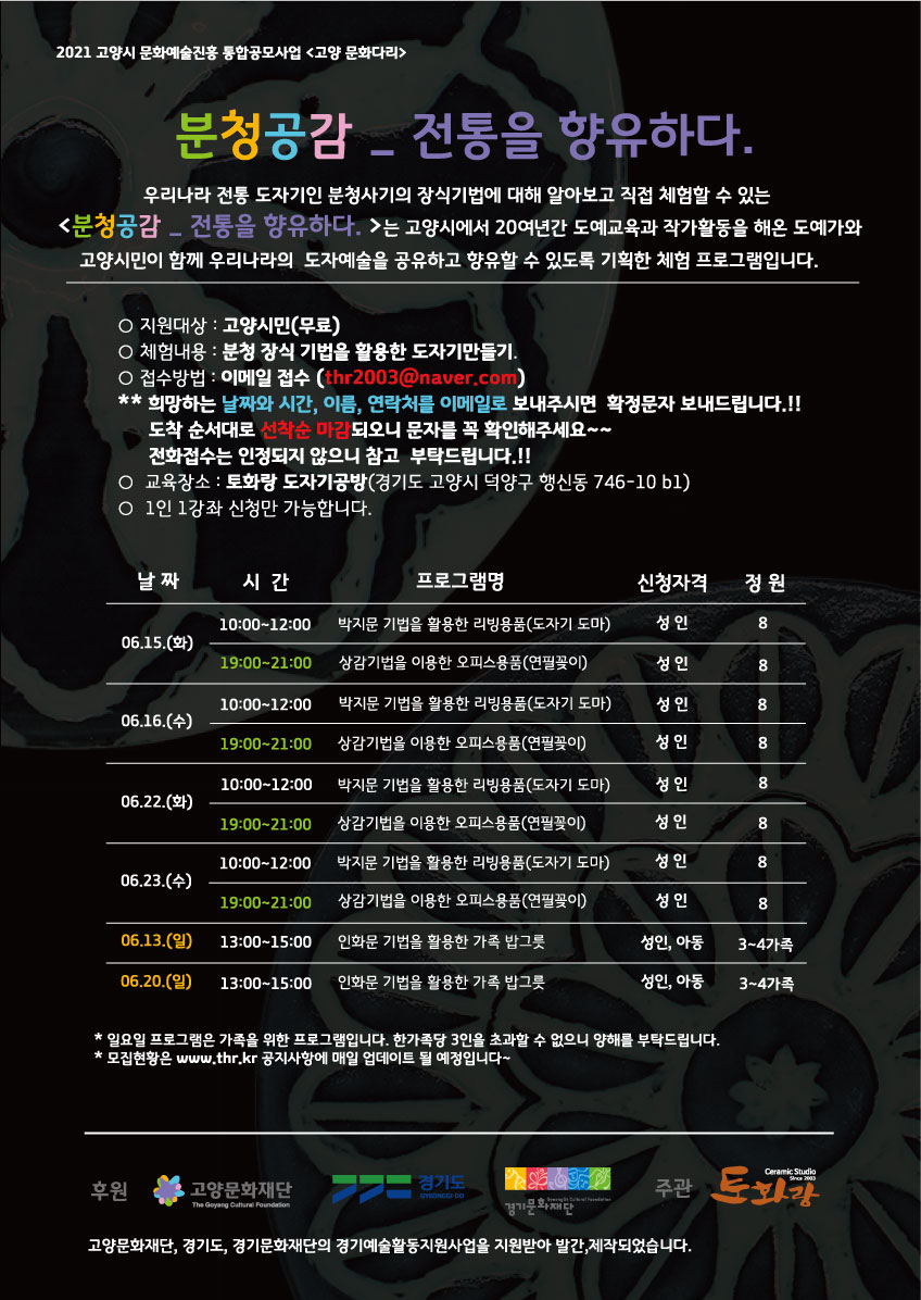 우리나라 전통 도자기인 분청사기의 아름다움을 눈으로 보고 손으로 느낄 수 있는 특별한 기회입니다. 분청 장식 기법을 활용한 도자 체험 프로그램을 통해 우리나라의 전통공예인 도자예술을 향유해보세요!!