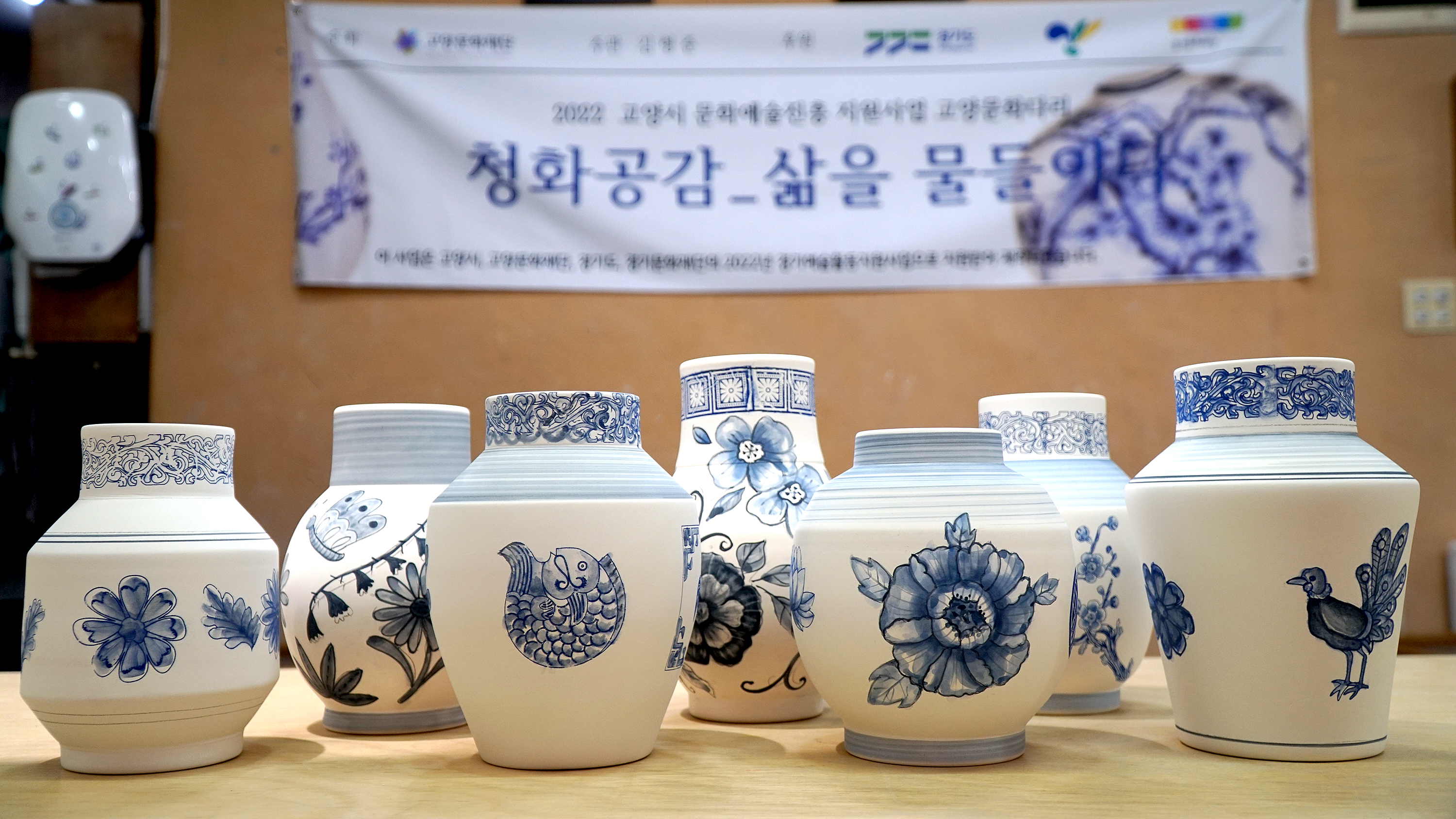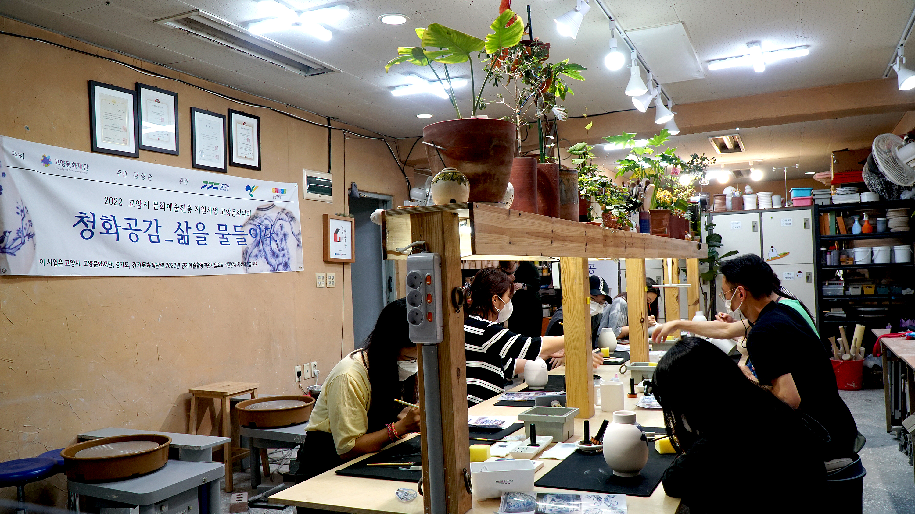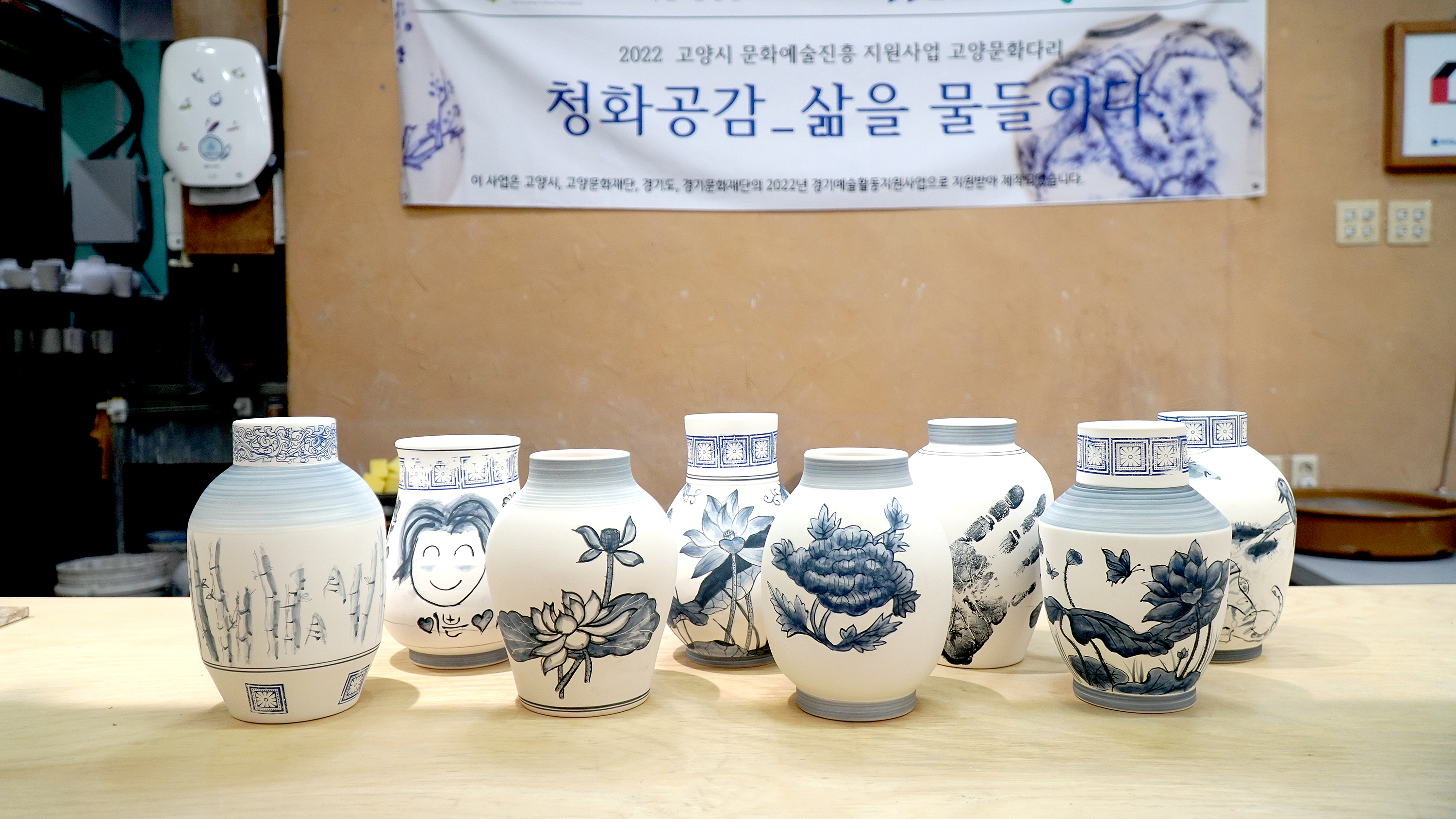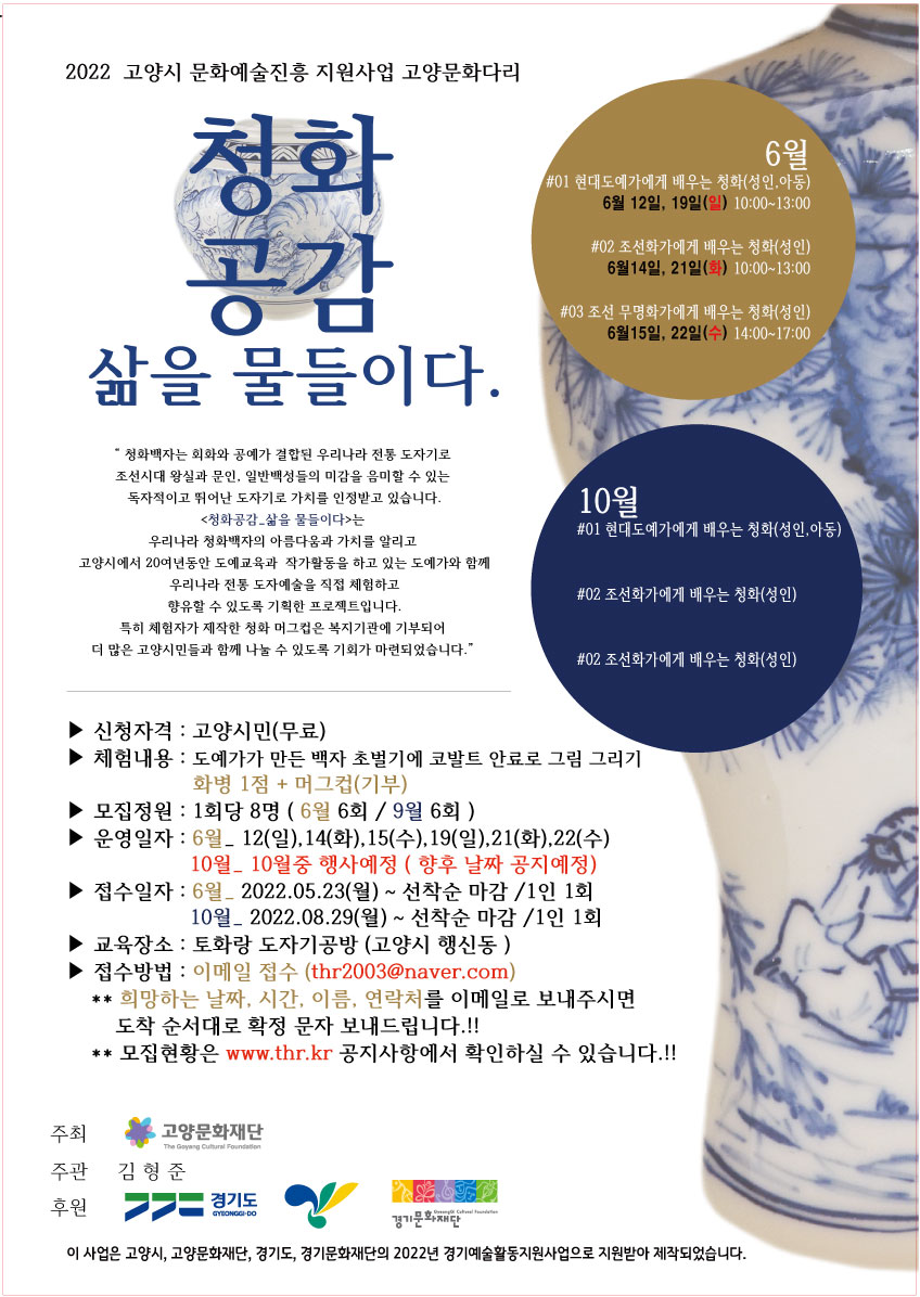 <청화공감_삶을 물들이다>는 우리나라 청화백자의 아름다움과 가치를 알리고 고양시에서 20여년동안 도예교육과 작가활동을 하고 있는 도예가와 함께 우리나라 전통 도자예술을 직접 체험하고 향유할 수 있도록 기획한 프로젝트입니다.